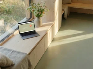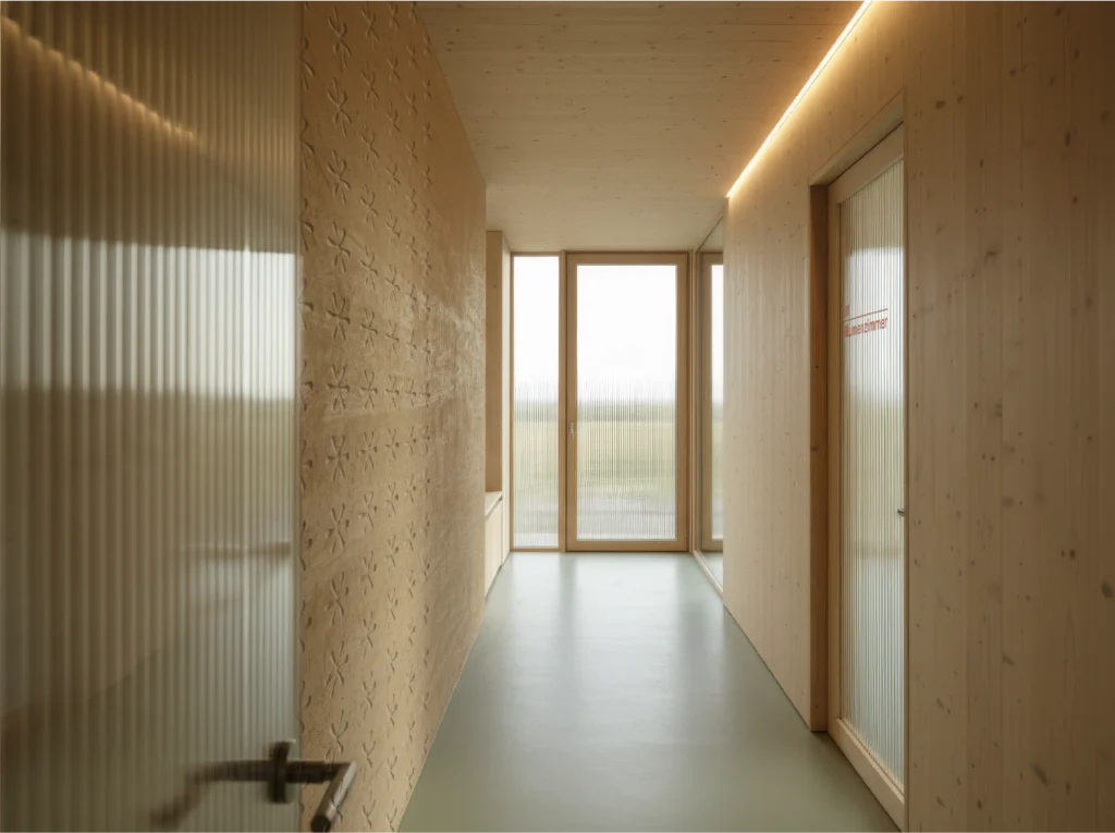 Von dort aus entwickelte sich alles Weitere logisch. Tonalität, Gestaltung, Bildwelt. Und dann passierte das, was gute Markenarbeit ausmacht: Das Design blieb nicht auf der Festplatte. Es floss in die Architektur. Helles Holz, natürliche Materialien, Lehmputz mit geprägtem Logo. Sogar von Hand gesammelte Blüten wurden in die Wände eingearbeitet. Gestaltung und Raum sind nicht nebeneinander entstanden, sondern miteinander. Jede Entscheidung zahlte auf dieselbe Haltung ein.