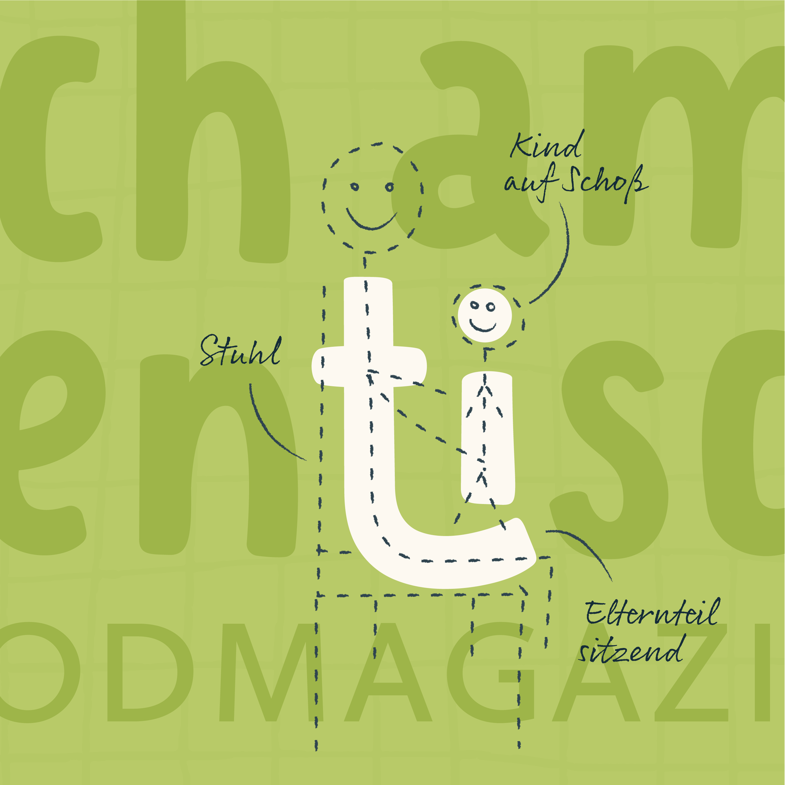 Das “t” spielt im Zusammenhang mit dem “i” eine elementare Rolle für das Logo. Das “t” symbolisieren ein Elternteil auf einem Stuhl sitzend und das “i” ein Kind auf dem Schoß des Elternteil sitzend . Das organisch geformte Rechteck hinter der Logo-Schrift symbolisiert den Familientisch.